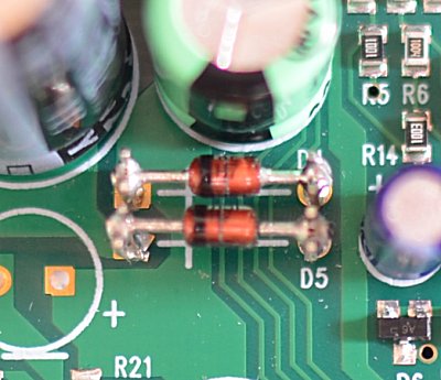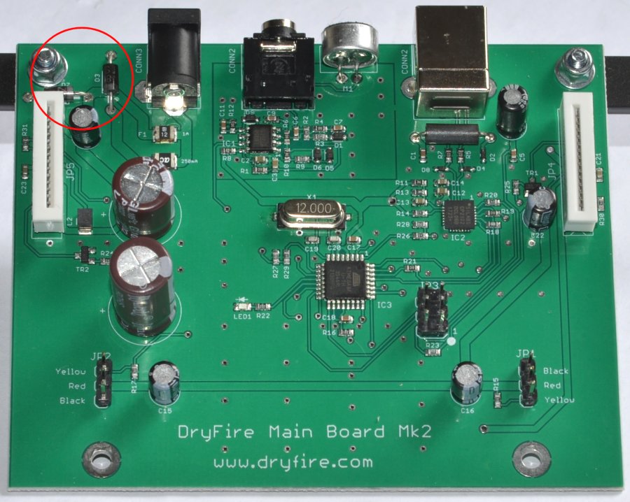 The Mk2 version of the DryFire main board (released in May, 2022) uses different diodes in a slightly different place - see below. Check the photo to enure the replacements are fitted the correct way round.