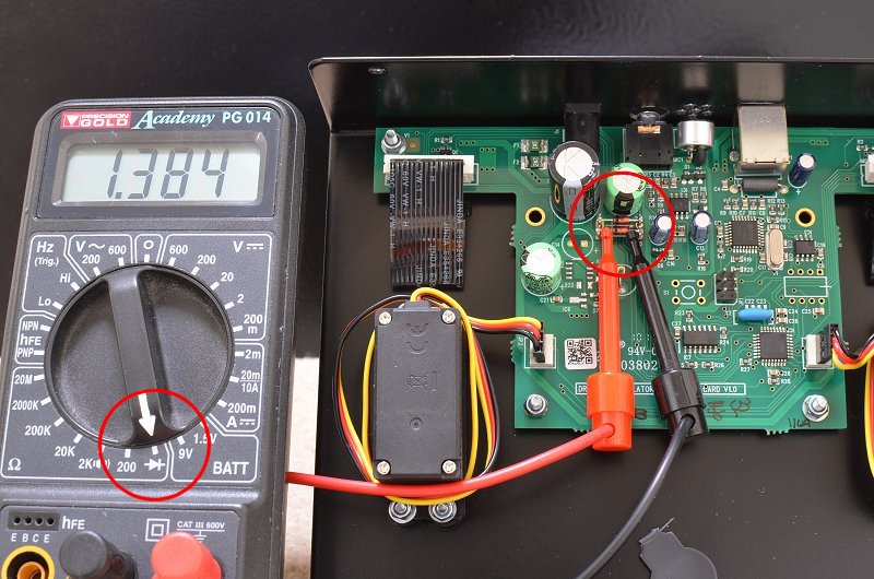 With everything still disconnected, use the diode testing function of a multimeter to check each diode to see that a reading is obtained as shown below. (The exact value is not important).