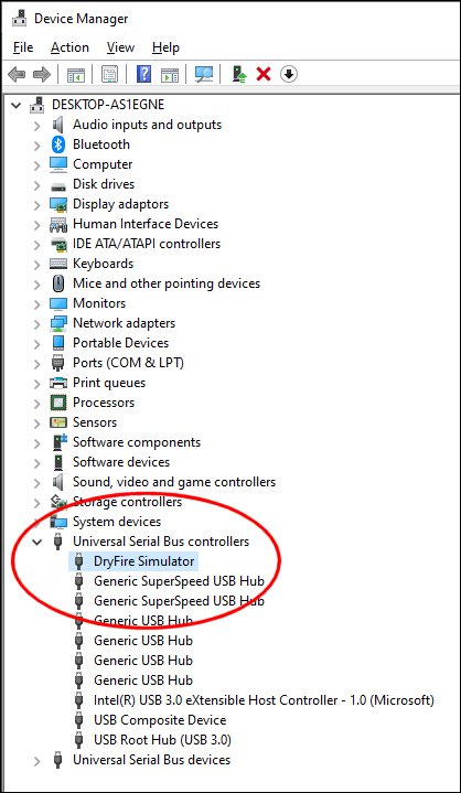 Check that the simulator is seen by the operating system. For Windows 10 look in "Device Manager" - you should see "DryFire Simulator" in the list of "Universal Serial Bus Controllers".